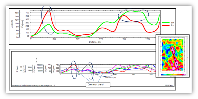 XRF of soils analysis provided an indication of mineralogical trend over the Pb-Zn Mineralization area, which is influenced by the weathering profile, underlying lithology and structural trends. It was suitable for assessment of lead, zinc and other base elements and when contoured reflects lithological variation, structural influences and elemental anomalism.